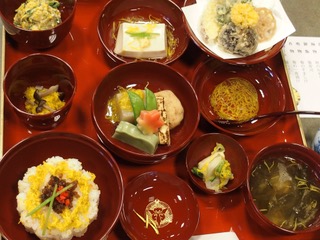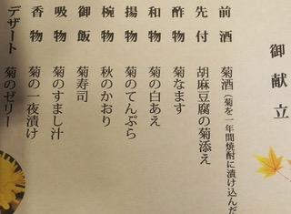 ところで、黄色中輪咲きの「坂本菊」(写真③)は、大津市の郊外・比叡山坂本地区で古くから細々と栽培・利用されてきた食用菊ですが、その来歴は中国から1200年前に渡来したとされたり、かつては比叡山の僧らの精進料理として珍重されたなどとされながら、真実のところは全くの謎とされています。松尾芭蕉が元禄4年(1691)に近江(滋賀県)堅田で“菊のなます”を詠んだ句がありますが、案外、その“坂本菊”を賞味したのかもしれませんね。比叡山が紅葉に染まる頃、明智家の菩提寺・西教寺では”坂本料理菊振興会”の主催で「菊料理を食べる会」が行われ、食前酒からゼリーまでのフルコースを楽しもうと年毎に参加者が増え続けているようですよ(写真④)。