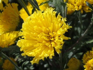 生薬の「菊花」はキクの頭状花を乾燥したもので、解熱、解毒、鎮痛、消炎、血圧降下作用などがあり、中高年層に多い顔面痛、頭痛、高血圧症などの改善を目的として漢方薬に配合されています。また菊花を入れた枕は安眠を誘う効果があるとされています。ただし、残念ながら、日本では薬用菊は全く生産されていません。日本に輸入される菊花は主に「黄甘菊」ですが、薬草園で栽培されている“杭白ギク”(写真①)は、1980年に中国馬橋人民公社から導入したもので、主に茶材として利用されるものです。その頭花乾燥品にはフラボノイドが多量に含まれていて、福井県立大学生物資源学部・村上茂教授の研究によると、食事後の血糖値上昇を有意に抑えるとともに、抗酸化、抗炎症作用などもかなり強いことが判ってきました。