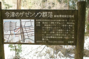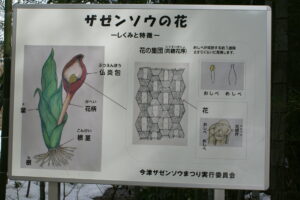 極寒の中、いち早く周りの雪を溶かしてポッコリ顔を出すのがザゼンソウ(Symplocarpus foetidus)の花です(写真①)。葉を展開する前に、長さ8~20cm、幅5~15cmで紫褐色の仏炎苞(ブツエンホウ)という特殊な形状の器官に包まれた、長さ約2cmの肉穂花序をつけます。和名は、仏炎苞と中の花序を“座禅する僧の姿”に見立ててつけられたものです。その苞葉は、稀に淡紫色、緑色または白色、時には濃褐色の斑点を有する個体も存在しています。雌花の成熟期になると、雌しべは23℃ほどに発熱することが知られています(写真②)。北海道から本州の日本海側に分布し、谷間の陰湿地に生育する多年草です。滋賀県高島市今津町弘川地区にある湧水湿地の群生地は緑地環境保全地域に指定され、周辺住民によって手厚く保護・保全されています(写真③)。例年であれば2月下旬~3月中旬がちょうど見頃ですが、今年は雪が少ないので2月上旬から見ることができそうです。