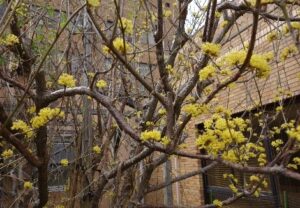 この時季、一つまた一つと枝に愛らしい黄色い彩りを添えていくサンシュユ。葉が出る前に花を咲かせます。