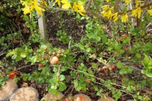 ⑩ クサボケ(日本の特産種、朱赤色の花、秋に黄熟する果実酒が美味しい)