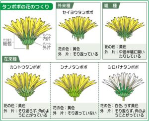 日本列島は、アラスカ、スカンディナビア、アイスランド、ヒマラヤとともに多種のタンポポを産する5大地域の一つとなっています。花の外側にある総苞片の形で在来種と帰化種を判別します。すなわち、白花、黄花合わせて20種ほどの在来種は、いずれの総苞も反り返らないのが特徴です(写真②)。在来種の大半は別の株の花粉を虫に運んでもらわないと結実しない“有性生殖をする二倍体種”で、種子は夏の高温によって発芽が抑制され、一定期間休眠した後、自然条件下では9月下旬~10月上旬に発芽する性質を有しています。