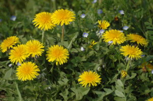 春の温かい陽気に誘われたように草むらではタンポポの鮮やかな黄色の花が目立ちます。日本各地には多くの品種が分布していますが、若狭地方を含む近畿以西から北九州で目にするのは主に関西タンポポ(Taraxacum japonicum)です(写真①)。3~5月頃に開く黄色の頭花は直径3cmほどで、普通、朝6~7時に開花し、夕方閉じます。またこの花は天候にも極めて敏感で、雨が近づいたり空が曇ったりしただけでも閉じる性質があります。葉や花茎を切ると、白色の乳液が出ます。果実は紡錘形で白色の長い冠毛があり、パラシュート形の瘦果(ソウカ)が風によって運ばれます。