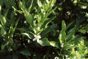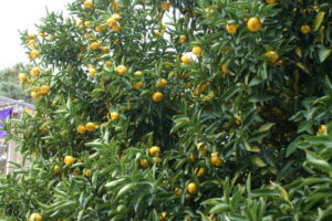 常緑の小高木で、高さ3~5mになります。枝は緑色無毛で葉を互生します。葉は光沢があり、長さ約8cmの楕円状披針形です。5~6月に咲く白色5弁花(写真②)は、小さいながらすっきりして美しく、芳香があります。黄色に熟す果実は10gと小さく(写真③)、扁球形で、果皮は薄くてたやすく剥皮できます。苦味はありませんが酸味が強く、生食には不向きです。樹は病害に強くて栽培しやすいので、暖地の庭園樹にされます。