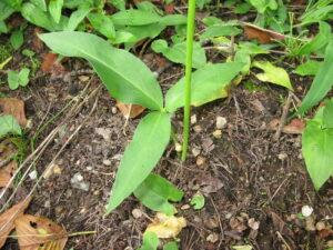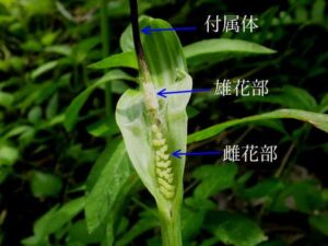 ⑥ カラスビシャク(緑色の仏炎苞という特異な形の花、庭や畑の雑草、つわり止めの妙薬)
