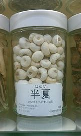 漢方では本種の球茎を夏に掘り取り、その外皮を除いて乾燥したものを「半夏(ハンゲ)」と称します(写真④)。その主な薬効は去痰、鎮吐作用で、「生姜」とともに用いられる場合が多く、昔から妊婦のツワリ止めなどに利用・重宝されてきました。