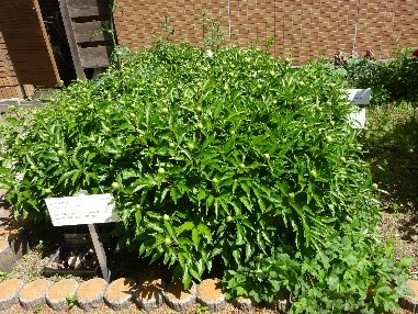 初夏の眩しい陽射しを受けて薬草園では、初々しい新葉や花たちが生命力に満ちた輝きを見せています。薫風が心地よいベンチに腰掛け、薬草たちを愛でるのも風情があります。