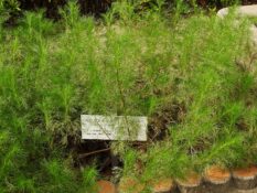 カワラヨモギ(Artemisia capillaris)は、名前の通り、大きな河川の土手や河原の砂地に生えています。およそ“らしくない”小さな花の形態が、路傍でふつうに見られるヨモギによく似てはいますが、葉は糸状で細くヨモギとは全く異なる様相で、特に晩秋の頃に株元で芽吹いたロゼット葉は銀白色の微毛に被われています。また川の上流に生えるものは茎が直立して葉は緑色、花はやや小ぶりなのですが、下流になるほど草丈が低くなり、特に海岸の砂地(例えば、鳥取県北条砂丘、高知県足摺岬など)に生育するものは茎が低く横に広がり、葉は銀白色を帯びて個々の花が大きいなど、一見異種に見えるほどの違いがあります。それらの変異は連続的で、かつ花の形態としては全く同じなので、植物分類学上は特に区別されませんが、場所を移して栽培してもその外部形態はほとんど変化しないので、”生態変異”と考えられています。薬草園では滋賀県野洲川の上流域から挿し穂を採集し、継代栽培しています。